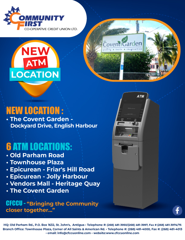Community First Co-operative Credit Union announces its newest ATM location: Covent Garden-Dockyard Drive, English Harbour.